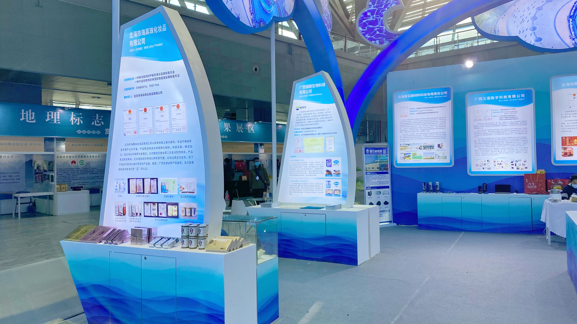 本屆發(fā)明展為期3天,主題為“加強(qiáng)知識產(chǎn)權(quán)保護(hù)運(yùn)用 推進(jìn)知識產(chǎn)權(quán)強(qiáng)區(qū)建設(shè)”。北海展館以藍(lán)色為主基調(diào),頂部以北海風(fēng)景圖環(huán)繞、用波浪形狀點綴,展臺展板配以帆船、珍珠貝等形態(tài),突出北海特色和韻味。北海市組織23家企業(yè)共55個項目參展,涵蓋電子信息、海洋產(chǎn)業(yè)、特色食品、能源材料等幾個大類的知識產(chǎn)權(quán)發(fā)明創(chuàng)造成果。其中,惠科8列陣基板顯示器、三諾藍(lán)牙音響及筆記本電腦、翼界無人機(jī)、蘇茂偵查醫(yī)療救護(hù)機(jī)器人、恒興珠寶、海真珠化妝品、回頭客食品、益峰鴻食品等高新技術(shù)和地方特色產(chǎn)品受到了參觀者關(guān)注。